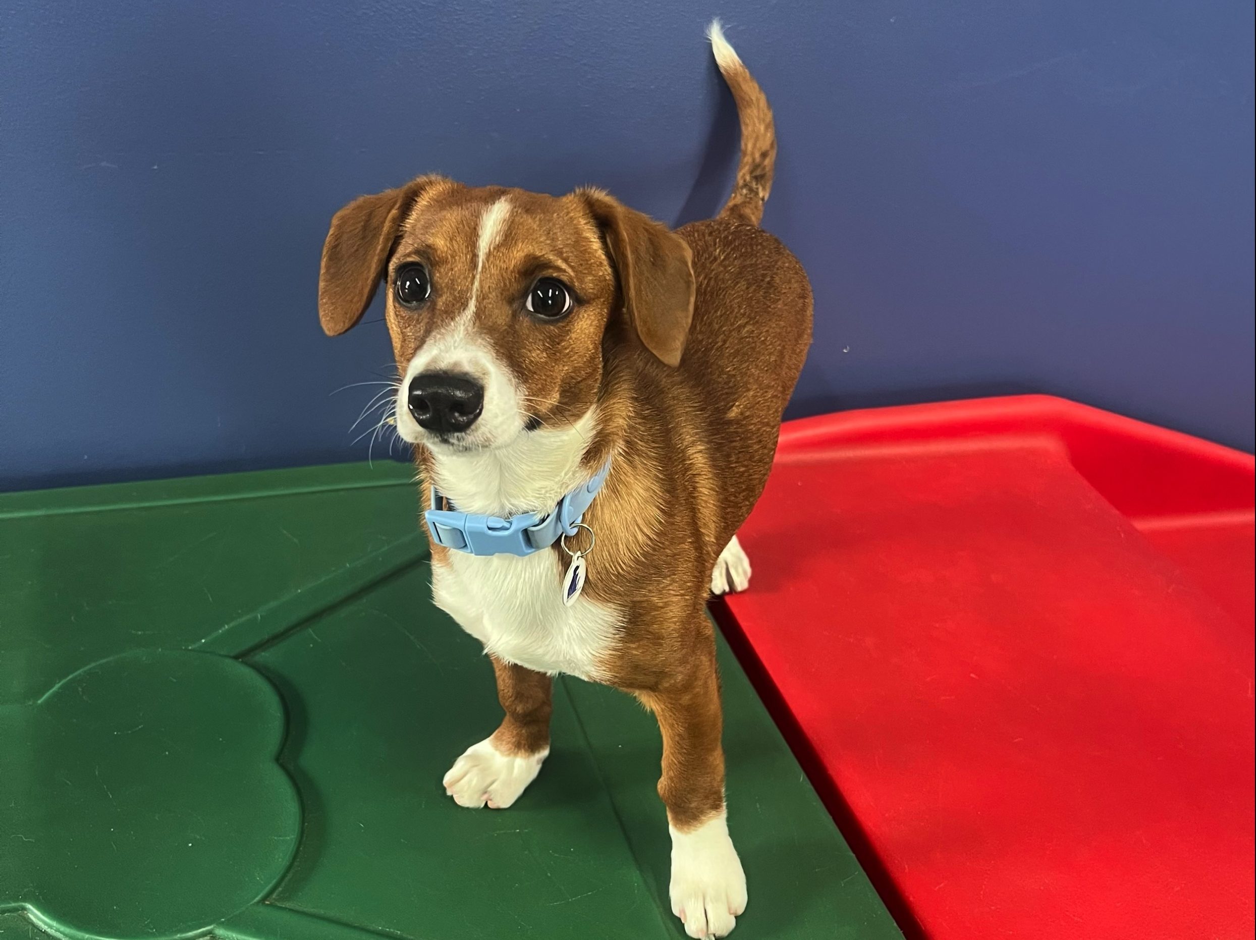 Dachshund/Beagle mix cutie! He is smart, snuggly & adventurous. These breeds are not lap dogs. They want to get out and walk and smell around the town.