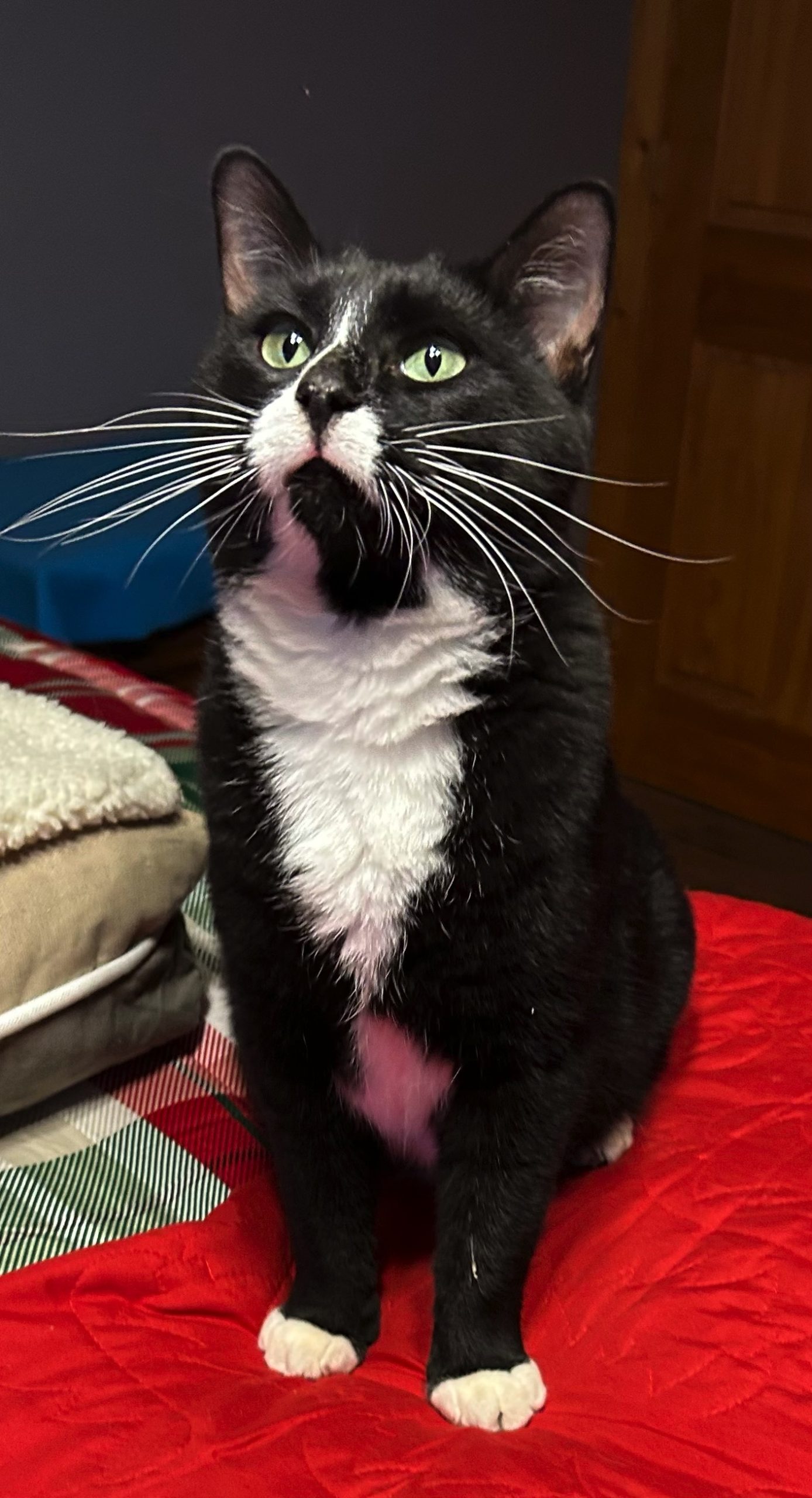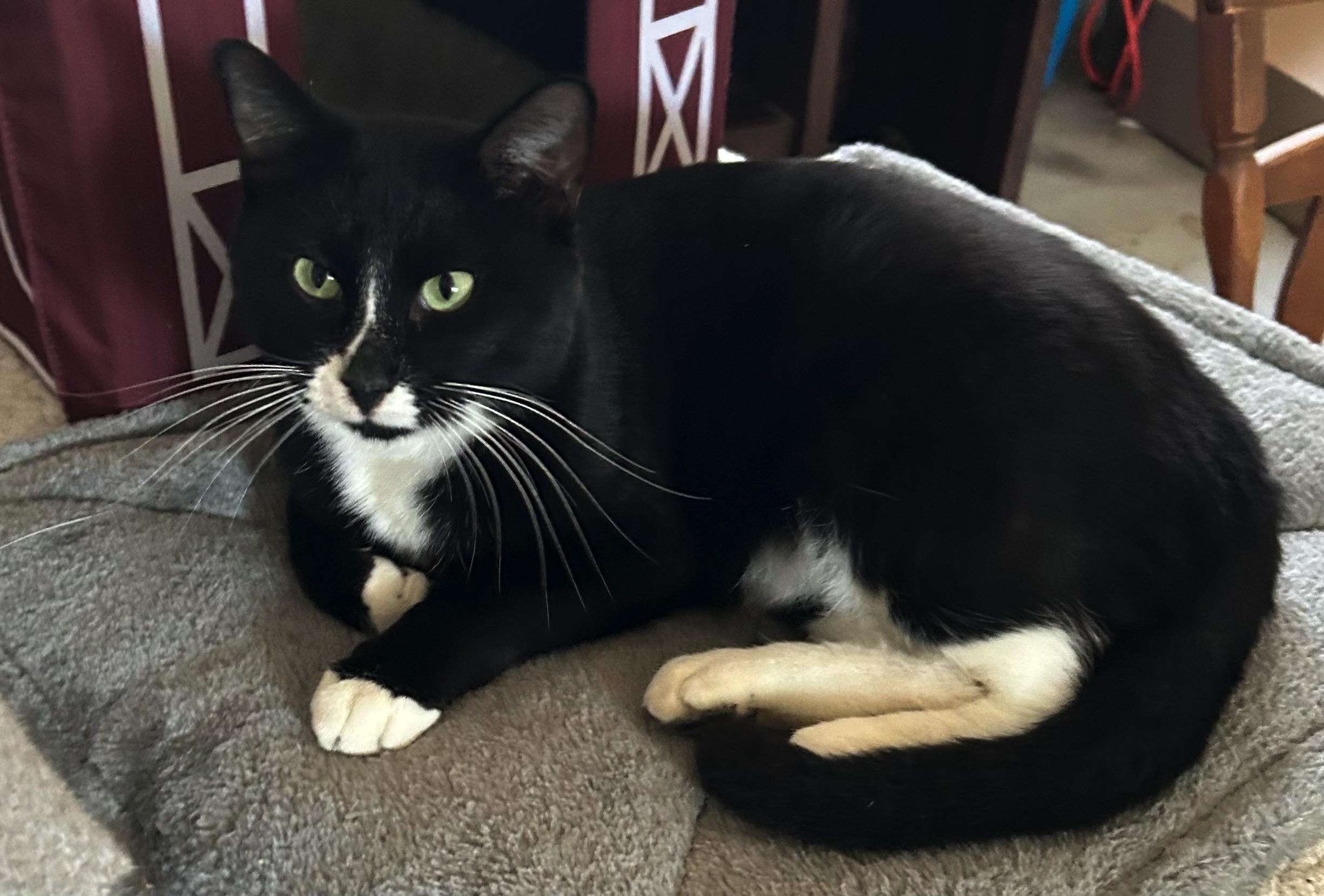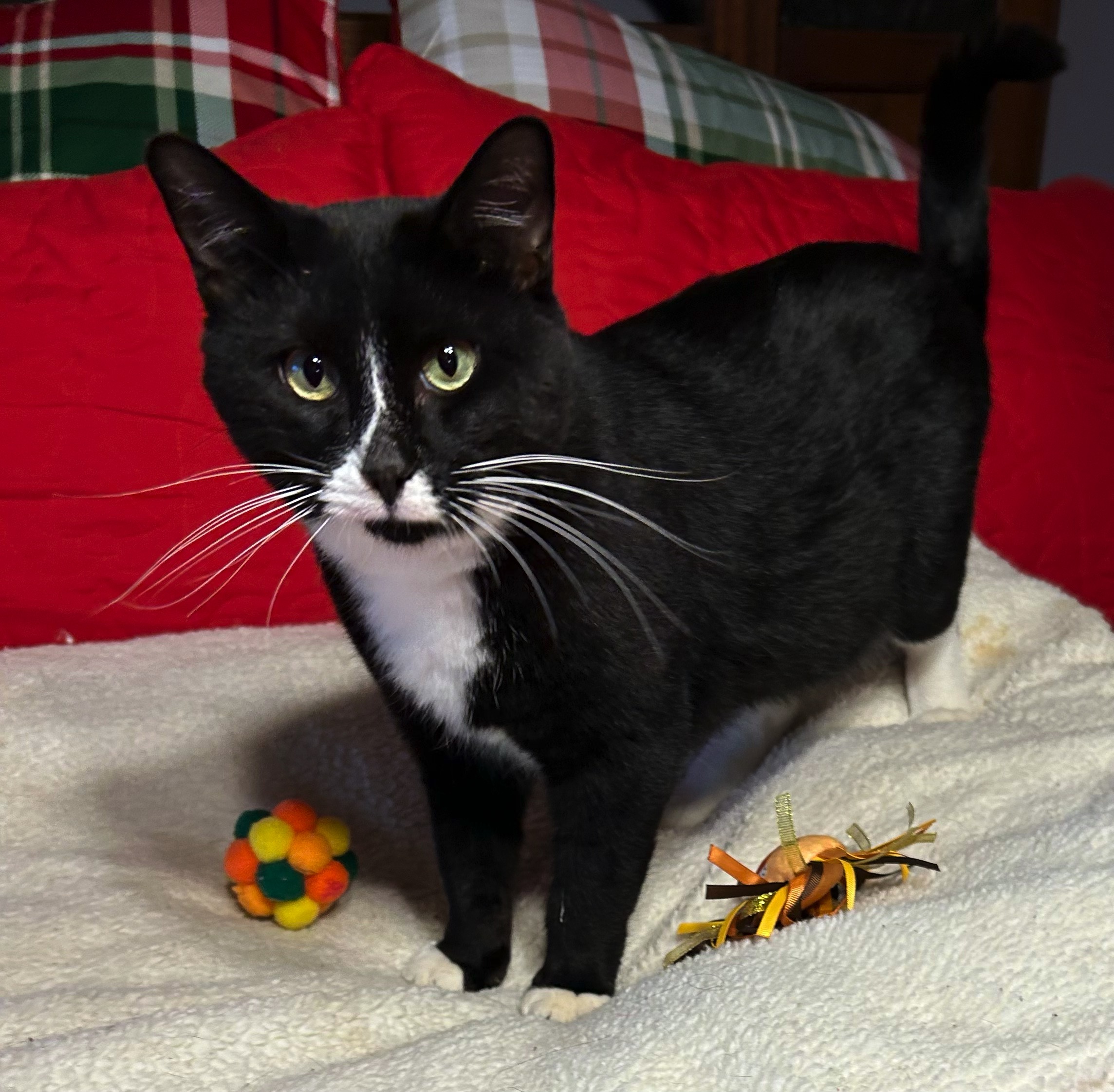 Warm cozy beds, consistent meals, dangly toys all tickle his fancy, as does standing on his foster mom’s lap being petted. He is very people oriented and loves the indoor life!