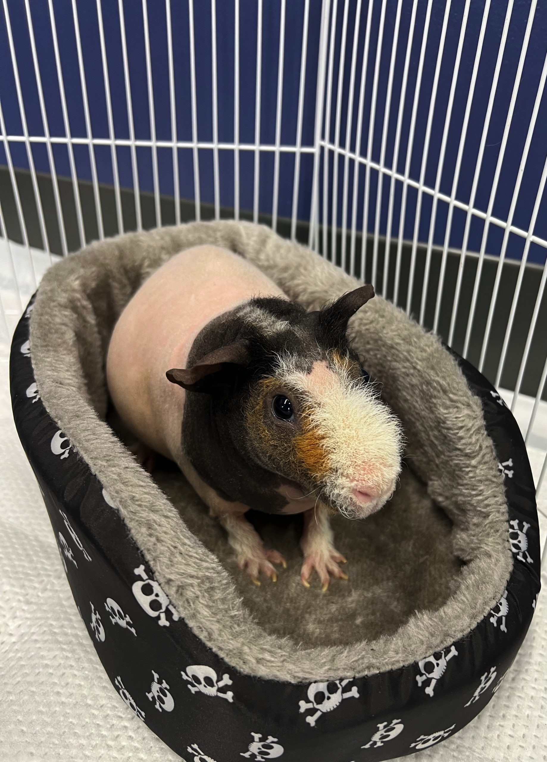 Charlie is a young skinny guinea (hairless guinea pig) looking for a wonderful home. He is so cute and loves to be petted on the fuzzy part of his face. Charlie is very social, and would love to find a family with another friendly male guinea pig to live with. Charlie enjoys trying new fresh foods and snuggling down in his soft bed, he is awesome!