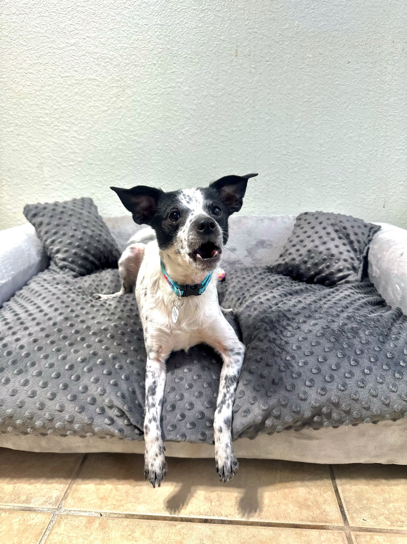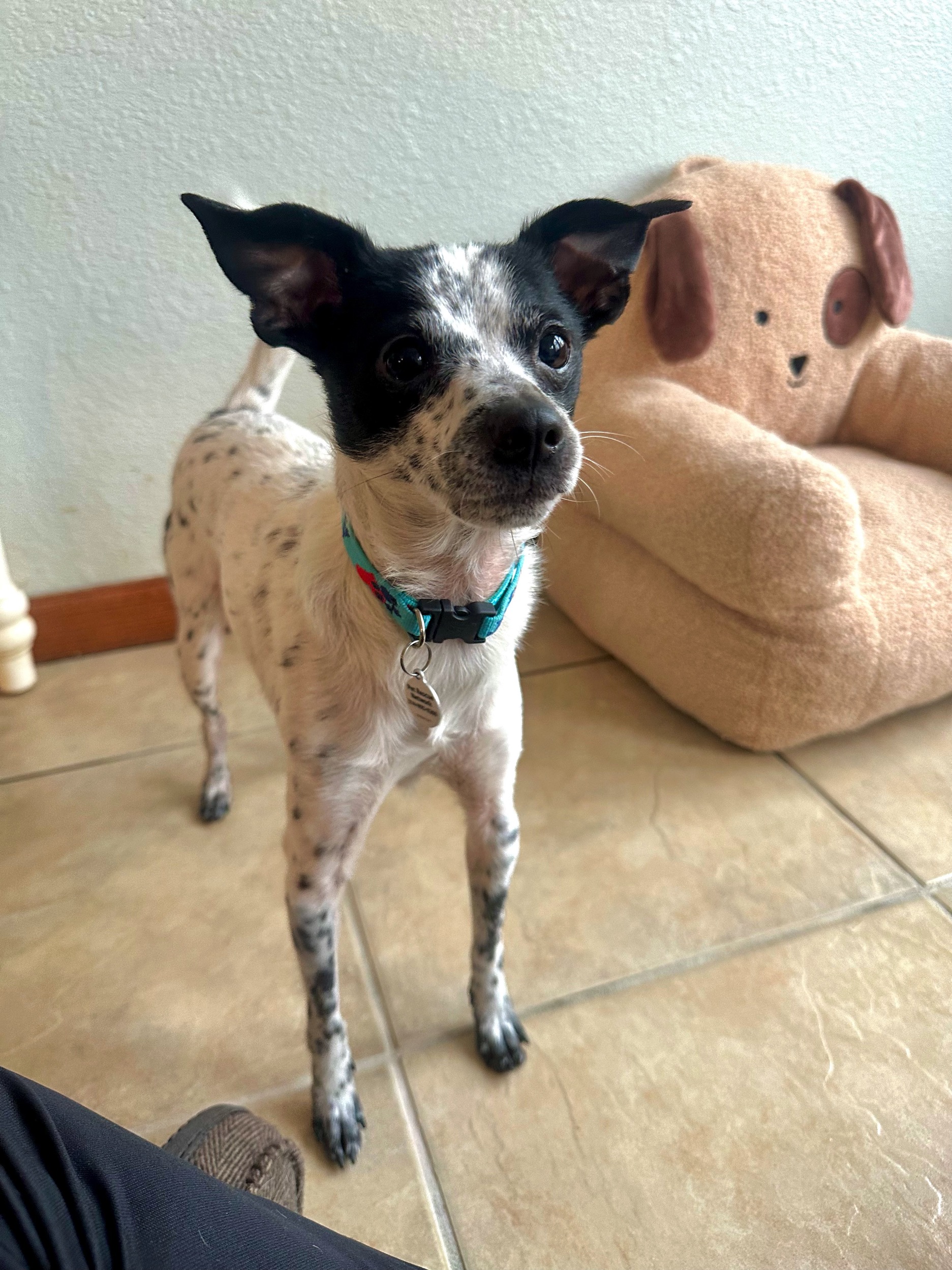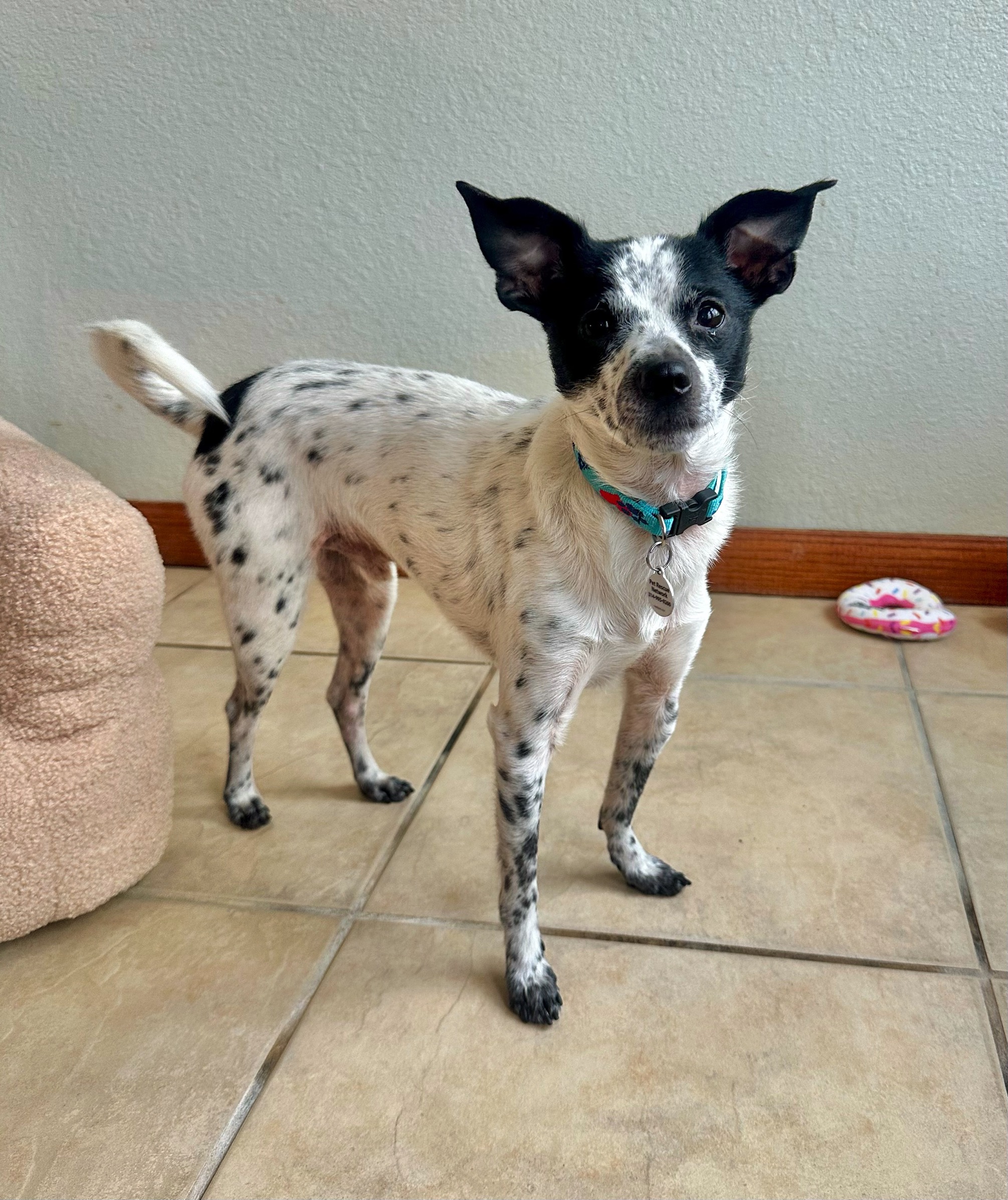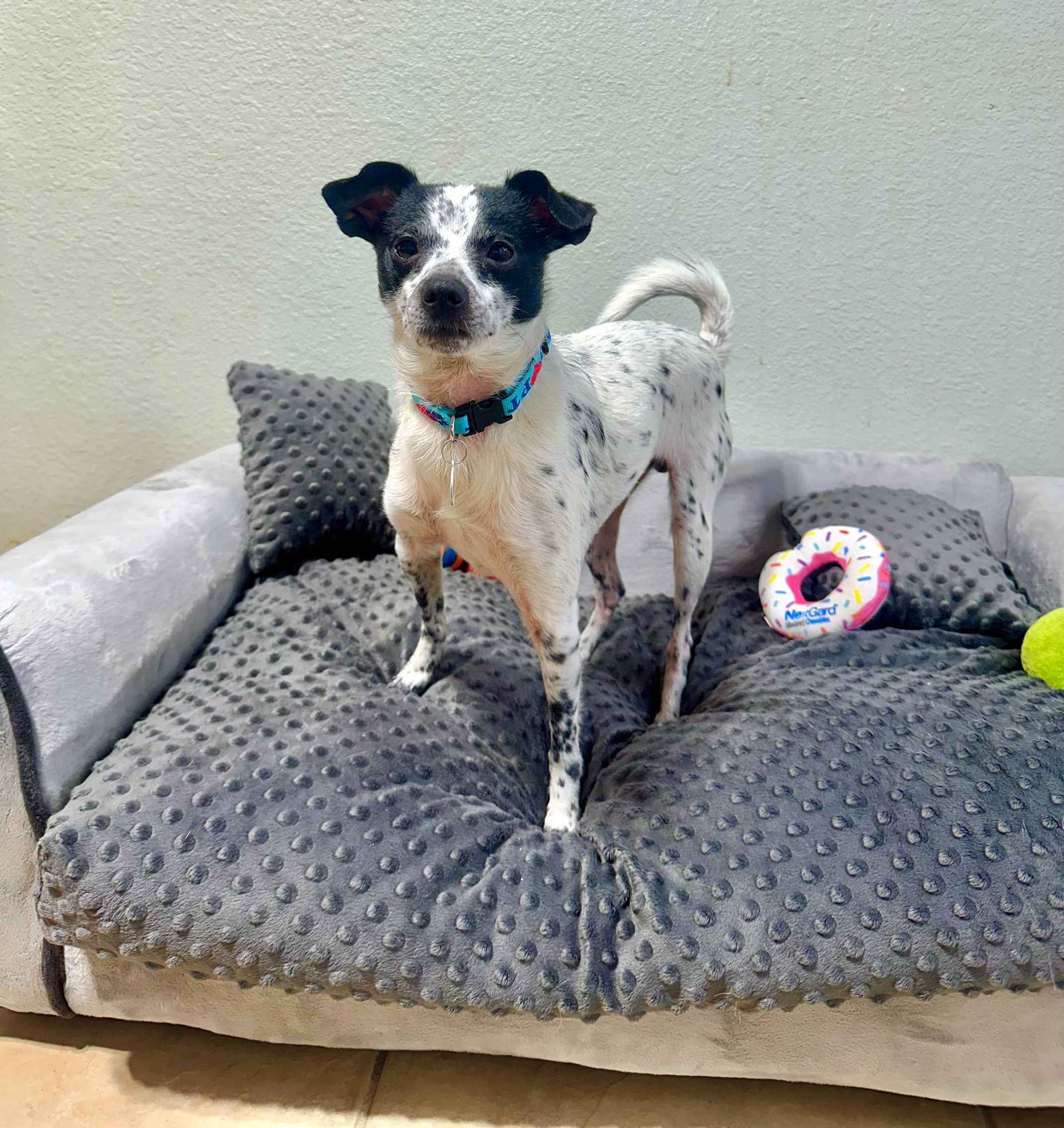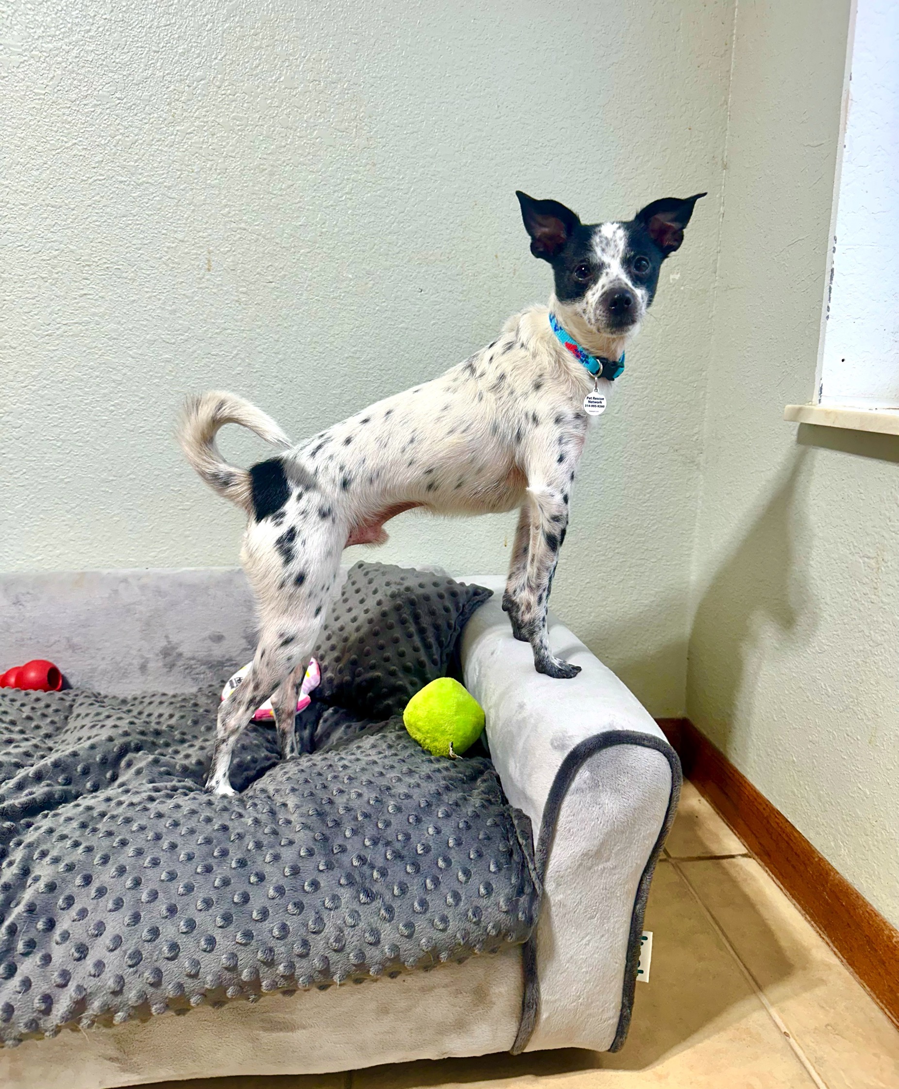 Dakota is a 3 year old cute little Rat Terrier mix, he weighs 12 lbs and is the sweetest little guy. He LOVES to play with toys, he can entertain himself playing with toys for quite a while. He also is very playful with the other dogs in his foster home. After a day of fun and playing, Dakota loves to cuddle up next to his person, until it’s time to snuggle under the covers.