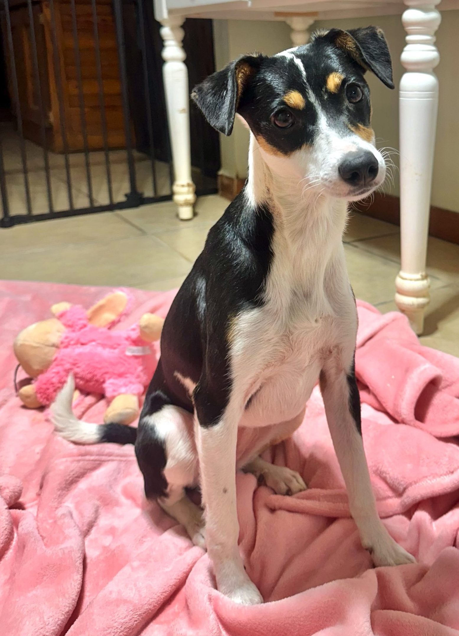 Gracie is a 8-9 month old Rat terrier mix, she’s tall and slender and a ball of energy, she could have some Jack Russell in her too. Gracie gets along great with other friendly dogs, she loves to play. She also likes to play fetch, and play with dog toys, she’s very good at entertaining herself. Gracie is very affectionate, and loves to cuddle up on the couch after a busy day of play.