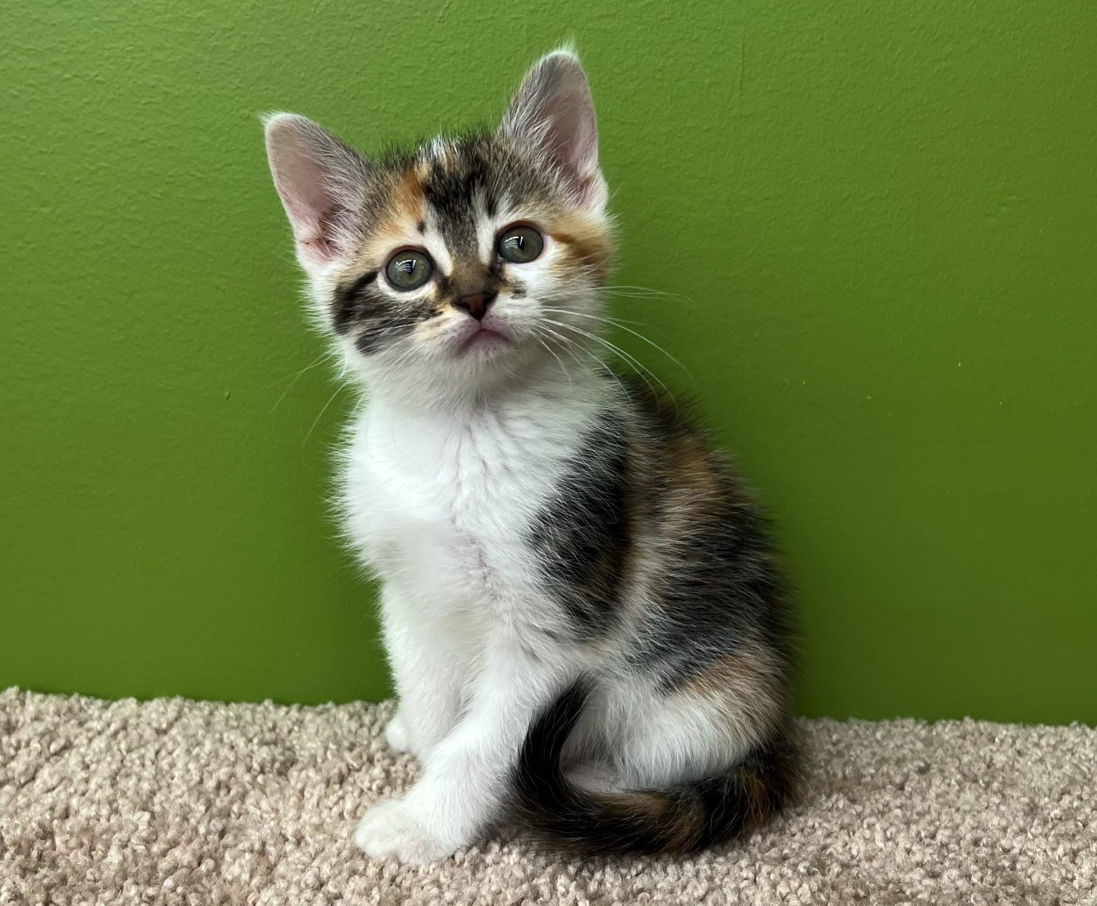 Pebbles and her litter mates are 9 weeks old and very friendly kittens. They enjoy playing like crazy baby cats but also being handled by their foster Mom. Pebbles is a stunning Calico with beautiful markings on her face. This litter will not last long so get your applications in, they are adorable!