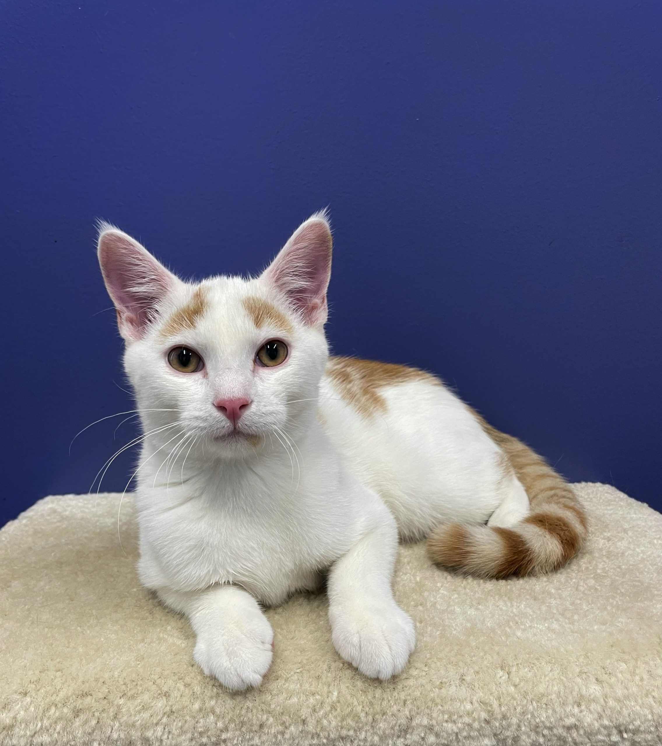 Popcorn and his sister Jilly are 12 weeks old and precious! They have a mostly white coat with stunning markings. Popcorn’s markings are bright orange tabby. These two kittens were found running onto a busy highway but are now safe and enjoying the pampered life with their foster mom. They are sweethearts.