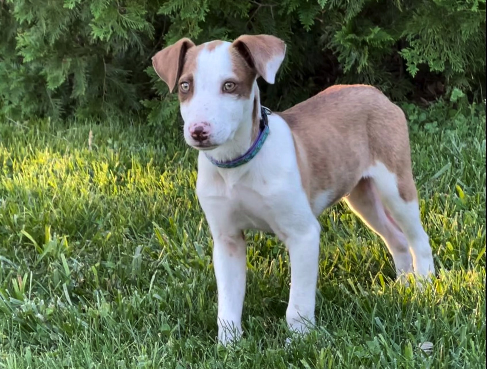 Rocky is 8 months old & weighs 35 lbs. Rocky was found on the side of the road in very bad shape, very thin and full of fleas. Now he is in great shape, and SO cute with those spots on his nose! He will be a medium sized dog as an adult. Rocky has a lot of energy and loves to play with the other friendly dogs in his foster home and would be happiest in a home with another dog. He is very affectionate and snuggles with his family at the end of the day.
