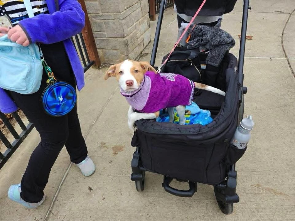 Rylee is 10-12 weeks old and weighs 14 lbs. She lives with young children and cats in her foster home and is great with both. Rylee is adventurous and already loves to walk and go places with her foster family. We have no idea what breeds she is mixed with but at least one of those ears is going to stand up soon! Ha