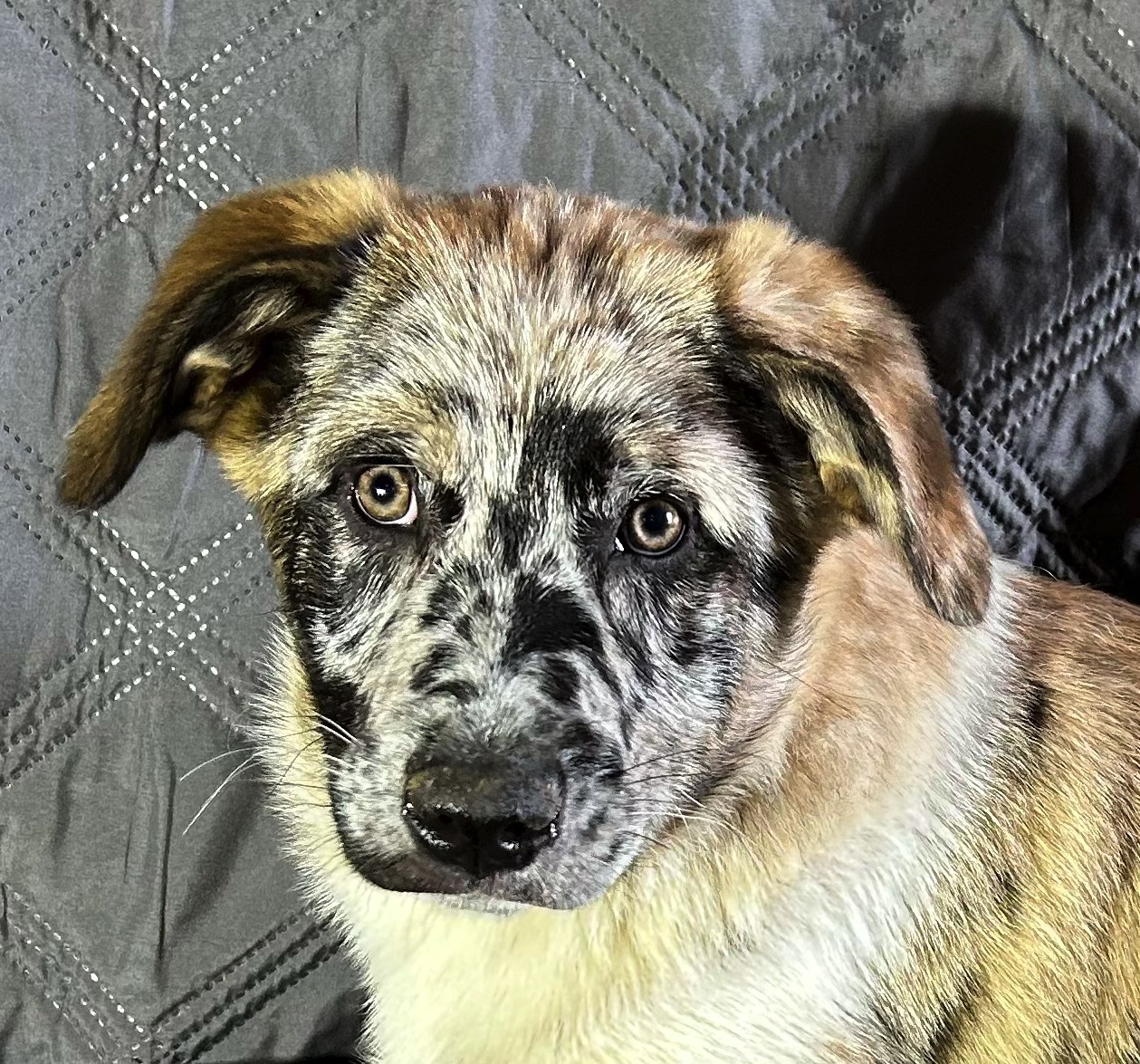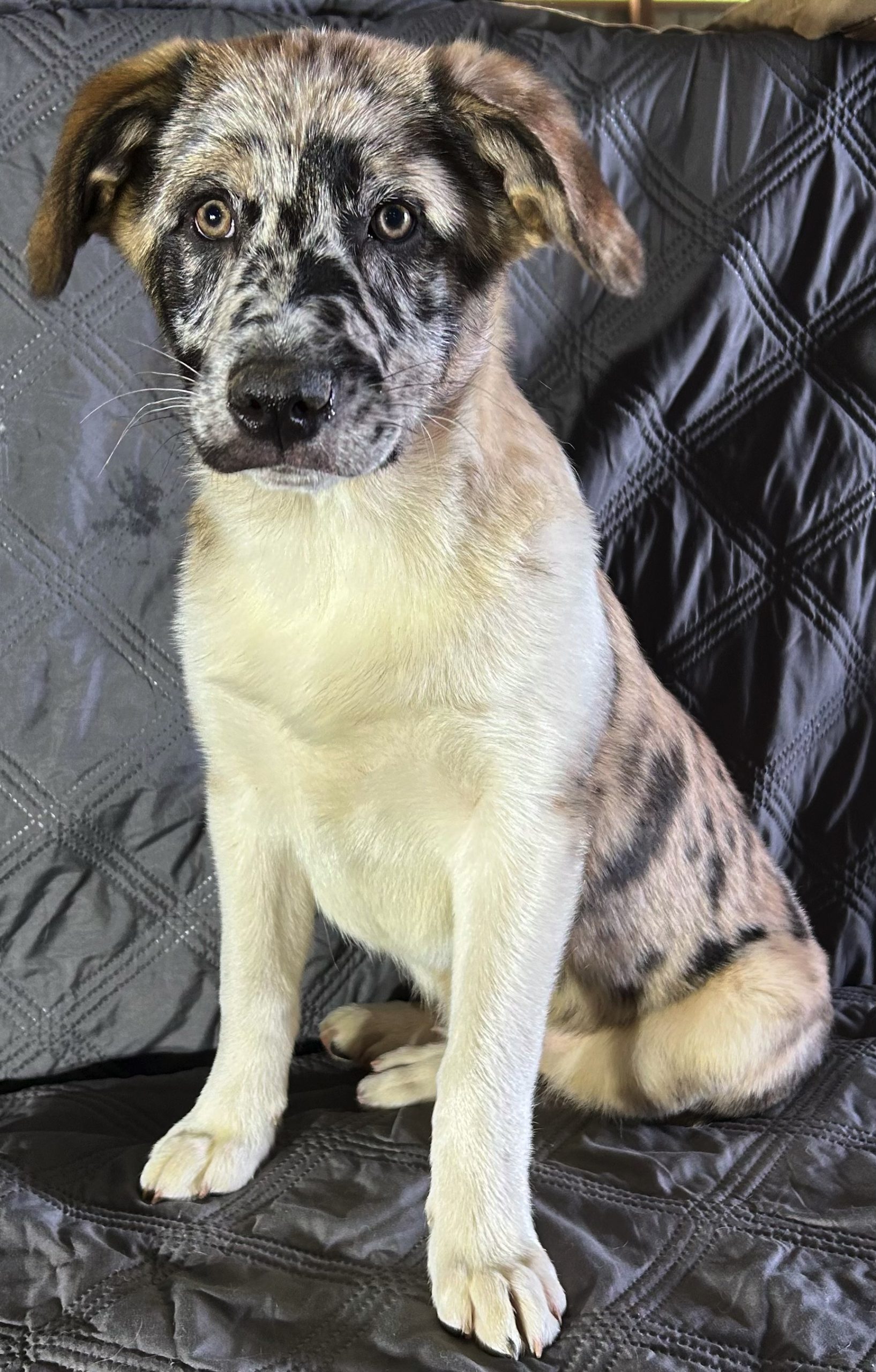 Snow and her littermates are 16 weeks old. Their mom is an Australian Shepard & dad is a Great Pyrenees. The puppies will be large dogs as adults. Snow has a unique, merle coat. They are all just beautiful & sweet!